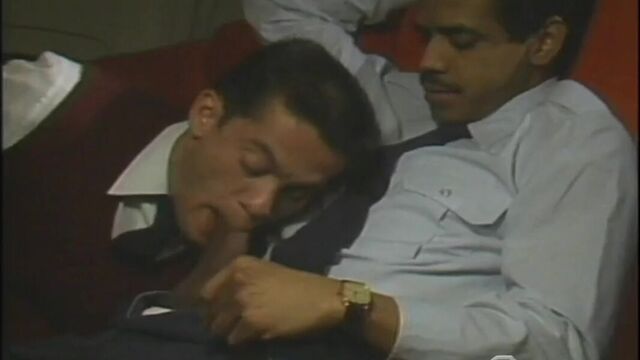 O.G. Johnson has returned to his seat but flight attendant Melchor is there to take as much of that cock in his mouth as he can. Buster is in the next row up and invites them up. So, it has now become a hot three way.