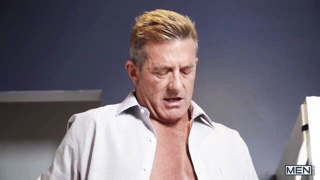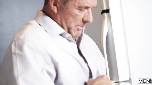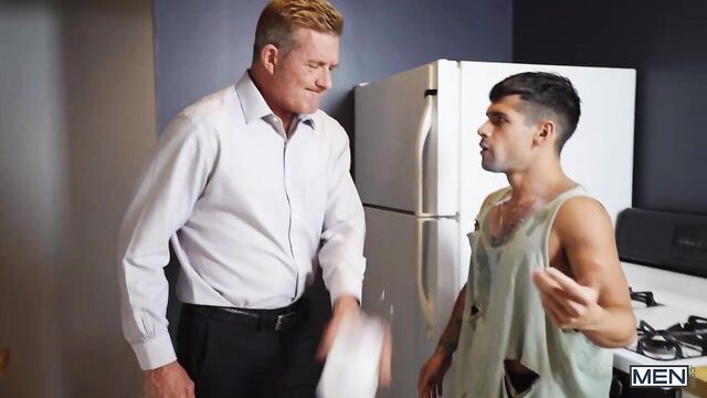Very different houses, very different dads. Who will win? Ty Mitchell is a rebellious punk from the wrong side of the tracks and he's moving in with rich zaddy Matthew Figata, who vows to make Ty obey his rules. Matthew freaks out when he finds Ty drinking milk straight from the jug and spilling it all over the floor, so he rips off the naughty twink's shirt and makes him clean it up. Ty wants Matthew to teach him a lesson harder, so the sexy silver fox wraps his belt around Ty's neck and makes him suck his dick. "My house, my hole" is the new rule, and Matthew eats Ty's to prove it, then fucks him doggystyle. The hot zaddy pounds Ty till he cums, then pulls out and paints Ty's ass with his jizz!