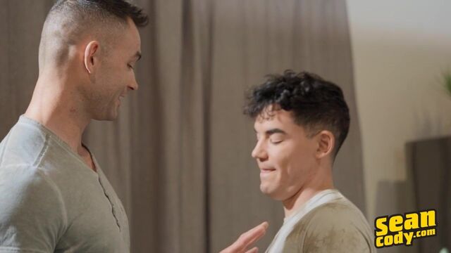 When Liam heads out to the grocery store, it's JC's turn to admire their buff neighbor Lan through the window as he oils up his muscular arms and broad chest. Soon, Lan's making his second visit next door, this time to kiss handsome JC who sucks his cock on on the couch, then rides him. The bottom puts a leg up on the sideboard as Lan pounds him doggystyle, and the guys are fucking on the couch when Liam gets home! "Hi, babe, I'm back," he announces, eagerly stripping down to join in and fuck his boyfriend as JC sucks the muscular neighbor. Then JC sucks his man's cock and gets plowed by Lan in missionary before Lan cums on Liam's face as the boyfriends 69. JC takes a facial from Liam as he orgasms too.