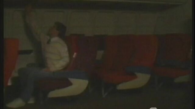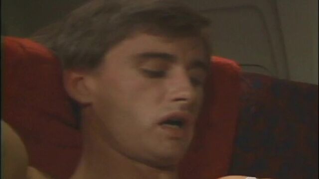 Flight attendant Ron Pearson takes passenger Mark Miller to the rear of plane. He quickly drops to his knees and begins slurping up Mark's dick. Ron takes Mark back to his seat and finishes sucking him off there.