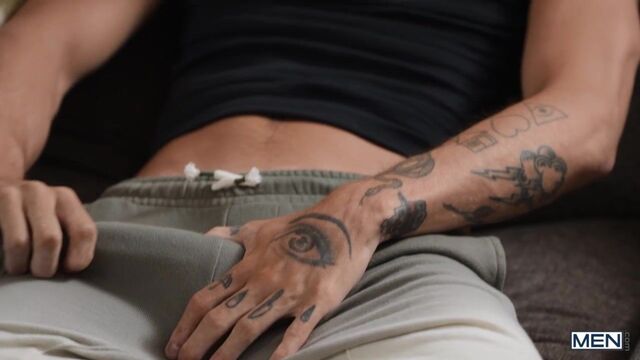 The new TV Theo Brady ordered has a feature he didn't expect. As hot tech Finn Harding goes behind the set to hook it up, Theo gets a surprising X-ray view of him naked! Theo wants to see more, and fair is fair, he takes off his shirt and pants to give Finn a look at his ass in his jock strap. Theo sucks the top, then Finn fucks him doggystyle on the couch. Athletic Theo gets fucked missionary while hanging off the furniture, then Finn picks him up in a stand-and-carry. The bottom cums on the mirror before taking a facial.