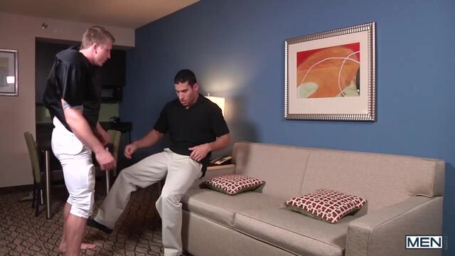 After a big game across state, football star Tom Faulk is craving cock. Instead of sleep, Tom finds his way in his coach Ricky Decker's hotel room and discover's how juicy his dick is. After swapping wet blow jobs, these two hot jocks take things to another level. Ricky bends over and takes every inch of Tom's throbbing cock in his tight and eager ass. Tom fucks his coach all over the hotel room until they spray their hot loads.