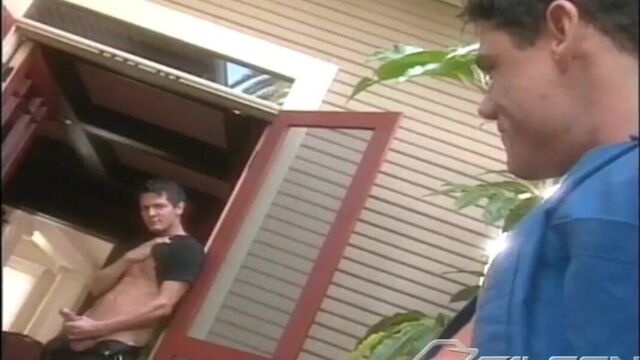 Dylan Reece meets Spike on the hotel patio. Like two proud roosters sizing each other up at a cockfight, they approach each other with curiosity and mischievous regard. The two studs spring into action, grappling and groping in a tango of mansex-Spike's long hard rod finding alll the hidden pleasures of Dylan's tightly muscled body. He slips his prick between Dylan's legs, sliding it back and forth, rubbing through the sensitive hidden flesh at the top of his thighs. Dylan leans back into Spike, stroking his own cock, while the tip of Spike's cock continues to poke through from between his thighs, prodding his ballsac. First Spike gets himself off, shooting geysers of hot cum, and then Dylan follows suit.