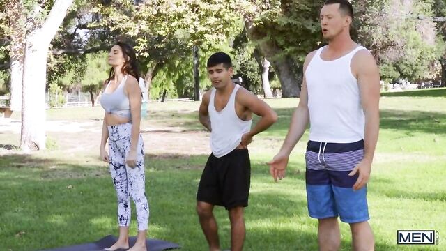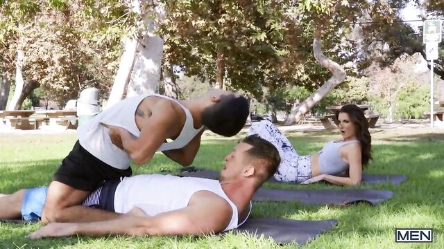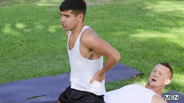 After seeing a sign for free yoga lessons in the park, Pierce Paris's girlfriend talks him into getting on the mat, but instructor Ty Mitchell seems more interested in getting his ass stretched out by Pierce's cock than in helping the couple stretch their muscles. The power yoga power bottom lets his hands roam all over Pierce's body, then takes him back home with him to caress his cock. Pierce picks Ty up for a standing 69, fucks his mouth and then penetrates his tight hole doggystyle. Strong and muscular Pierce even picks Ty up for a stand-and-carry before the flexible tanned twink takes his cock in piledriver, and Ty cums from that huge dick in his ass before taking Pierce's jizz all over his face.