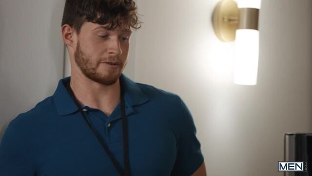 The new TV Theo Brady ordered has a feature he didn't expect. As hot tech Finn Harding goes behind the set to hook it up, Theo gets a surprising X-ray view of him naked! Theo wants to see more, and fair is fair, he takes off his shirt and pants to give Finn a look at his ass in his jock strap. Theo sucks the top, then Finn fucks him doggystyle on the couch. Athletic Theo gets fucked missionary while hanging off the furniture, then Finn picks him up in a stand-and-carry. The bottom cums on the mirror before taking a facial.