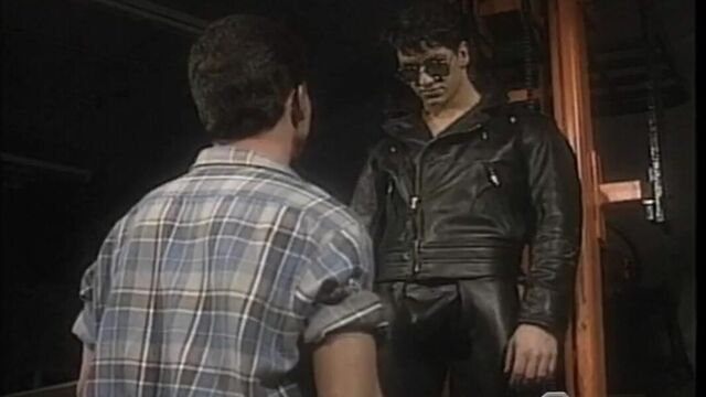 Ray Butler is dressed in jeans and flannel shirt as he drives around at night in his Toyota truck, looking for the man who knows just how to give it to him. After turning into a back alley, he spots masterful Kris Lord dressed in a leather jacket and chaps, dark glasses, boots and a g-string. Butler salivates, and can't keep his hot tongue off Lord's boots, moving his flickering tongue up to the supple chaps and g-string. Once the priming heats up, Lord whips out his premium dick-stick, and it is HUGE, about eight inches in diameter and 11 inches long! Needless to say, Butler can't keep his mouth off Lord's cock, and offers his puckering love-hole for an invasion by Lord's mammoth prick. First, however, Butler's hole gets prepared by fingers and then a big black dildo.
