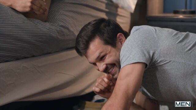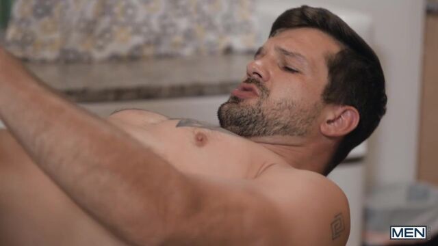 Horny bottom Angel Rivera has been waiting for his roommate to leave so he can have a little "me time." As soon as Brysen's out the door, Angel hurries to his sex toy drawer and fucks himself with his favorite dildo... not realizing Brysen forgot something. The top hears Angel's moans and sneaks closer to eavesdrop, then decides to give the bottom a scare, but he gets a surprise of his own when the startled Angel launches the dildo right into his face! Brysen feeds Angel his cock, and Angel rides his roommate, then takes a doggystyle pounding. Then it's Brysen's turn to get drilled bent over the counter, and he continues the flip fuck, taking Angel's cock in missionary till he cums and sucking out Angel's hot load!