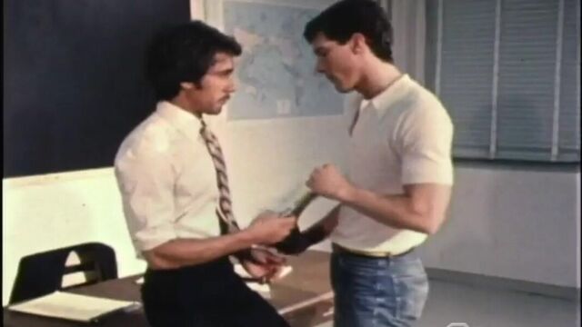 Upperclassman Part One: Handsome teacher Mark Perry gives class to a room full of eager students, both boys and girls. Even though the girls flirt with him, it's Brian Reed who catches his eye and his attention after class. The teacher takes control and bends the student over his desk and teaches him some new lessons upon the watchful eyes of fellow student Luke spying into the classroom window (Luke performs in the non-sexual capacity of a voyeur).