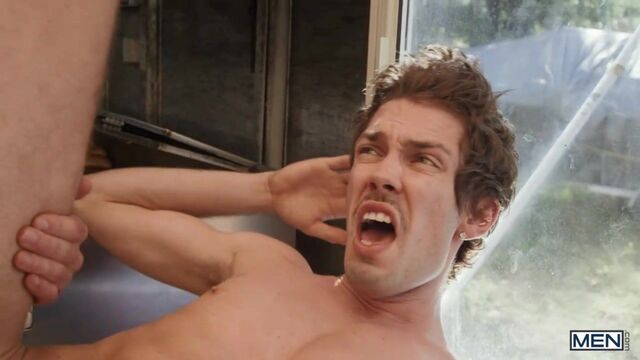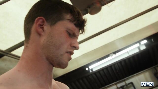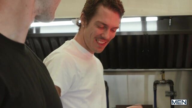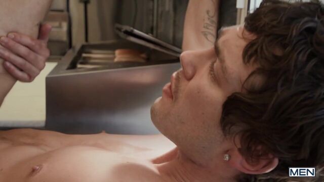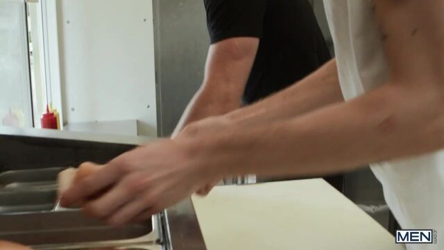 Chris Cool is a regular at Finn Harding's food truck, and not for the hot dogs. As Chris's flirting starts interfering with business, Finn invites him inside so they can work and play at the same time. Chris tries to take orders as Finn rims him, but he's not a people person... he's a cocky person, so he sucks Finn as the top works. Finn bends Chris over to fuck him doggystyle as Chris mans the window, then pounds the bottom on the counter. Chris takes Finn's big sausage in his buns till he cums, then puts the top's dick in a bun and takes some special sauce on his face.