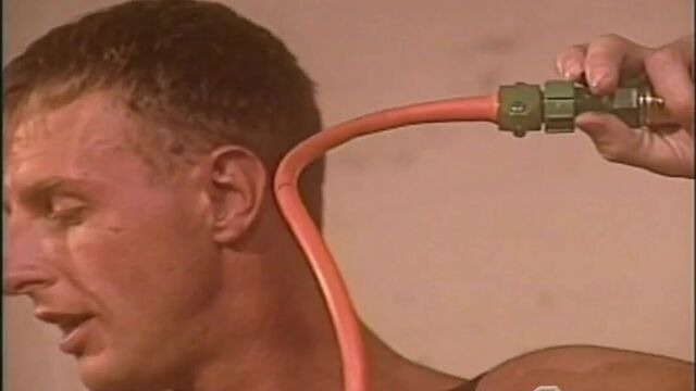 Perversion runs amok as crazed Grant King, with the assistance of a hooded Cliff Parker, gives Max Holden an enema that leaves him gasping for air. How much can poor Max take? Paralyzed with fear and a questionable desire to please, he surrenders any control to the wicked machinations of the sadistic Mr. King. Grant is in his element as he shimmies a hose up the slaveboy's ass and fills him up with gallons of cool water. Max is beginning to feel bloated and uncomfortable. Only after he's consumed an obscene volume of water is he permitted to let go. Sphincter muscles relaxed, he gushes the water out, emptying his belly and his bladder for long-needed redemptive relief.
