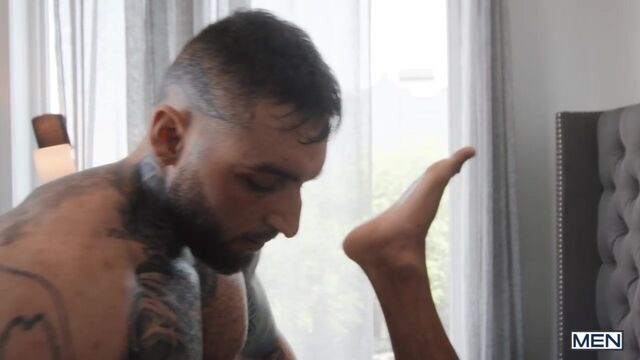 As the light streams in through the tall windows into their bedroom, tattooed top Tony Deangelo and sexy bottom Ihan Rodriguez sensually oil up their muscular forms. Tony joins Ihan on the bed, pulling down his briefs and oiling up that perfect booty before Ihan sucks him. Tony penetrates Ihan doggystyle against the quilted headboard, then the bottom sensually rides him. Ihan moans loudly as he orgasms while Tony pounds him hard and fast in missionary, then takes a creampie!