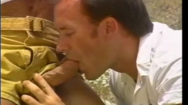 After an exhaustive hike in the desert, Steve Regis and Cole Phillips find some shade where they can rest and relax. They're soon entangled in each other's manly embrace, groping, kissing and playing with their meaty manbits. Luke Strong wanders in and watches the lust-driven lovers from a distance. Mesmerized by what he sees, he grabs his cock and begins stroking himself until he shoots a messy wad of spooge all over himself. Steve and Cole take off to find a new spot where they can resume play without prying eyes. Steve lays naked on a big granite rock and his partner lovingly swallows his horsedick down his throat. Then Cole gets on his back so Steve can ram his cock down his hole. He pumps and thrusts until he finally climaxes and cums.