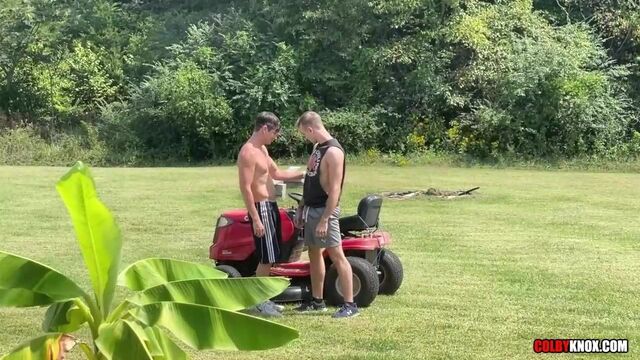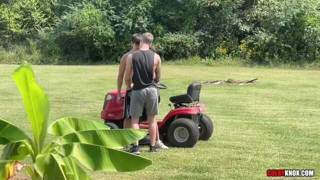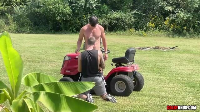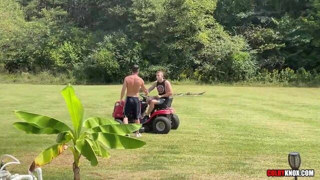 - Description: Finn August is riding the lawn mower in the ColbyKnox compound’s yard. Husbands Colby Chambers and Mickey Knox stare at the beauty. "The boy mowing our yard is so cute," Colby says to the camera. "We've been watching him go around in circles for the last fifteen minutes and I think I'm going to go chat him up." Mickey grins at his man's strategy, agreeing to hold the camera. Colby runs up and introduces himself. We don't know what he says but it must have been right. Finn stops working, gets on his knees, and pulls down Colby's shorts. "Let me feel that throat," Colby orders. "Go all the way down." Finn swallows all of that Colby cock, gagging in the process. Colby skull fucks, grabbing both sides of Finn's head. "Suck that sweaty nut sac," Colby whispers. Finn stands up and the two studs make out. Colby's fingers play with Finn's booty. That signal is all Finn needs. He puts his hands on the mower, sticking his ass out. Colby gets on his knees, slapping those jiggly cheeks. When he slurps Finn's hole, the yard lad is in heaven. "Just like that," Finn begs. "Your tongue feels so good." Colby is doing a lot of prep work on that hole, licking and lapping. When he stands up, Finn knows what's next. "Stick it in," he moans. Colby does, letting Finn do the initial work. All bottoms need a few moments to get comfortable with Colby's stout rod. "You're so big," Finn exclaims. Colby starts with small strokes. "Give me that ass," he demands. "Stretch me out," Finn replies. That backside brings out the beast in Colby because he rips Finn's T-shirt. "Feels so good," Finn whimpers. "You feel so good." Colby's thrusting speed picks up. Each stroke to the balls. The studs change positions. Finn reclines on the mower. One leg in the air. The other on the side. His hole pointing right to Colby's meat. Colby slowly reenters. Finn jerks his dick as his ass channel is filled. "Fuck, yes," Colby murmurs. "Take my dick." That dick strikes Finn's special spot too many times. He jerks a sizable load that smothers his stomach. "Think you can keep going," Colby wonders. Respectful and appreciative tops are the best. "Yeah. I can go a bit longer," Finn answers. Durable and frisky bottoms are the best. The studs change positions again. We get to see the cum dripping from Finn's abs. He leans against the mower and Colby gets back in. "God. Your ass is perfect," Colby observes, kneading a butt cheek. Colby gently, and slowly, fucks, giving Finn sweet kisses. "God. I'm so close," Colby says with clenched teeth. "You feel so good." Colby gives Finn an afternoon creampie. When he pulls out, Colby shoots more seed on the bottom's cheeks. "Cum filled hole," Colby observes. "It's fucking dripping out." He takes some of that lost man milk, puts it on his bloated dick head, and places the deposit back inside of Finn. Where, of course, it belongs. The studs kiss. "Same time next week," Colby asks "Yeah," Finn replies. "The yard grows fast," Colby says. Probably not fast enough, right?! :-) Welcome to ColbyKnox, Finn!