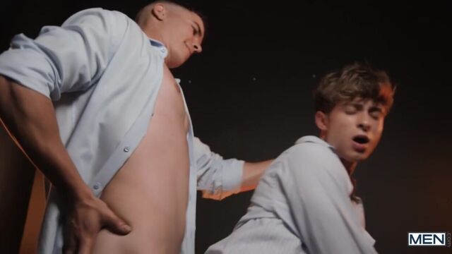 Tousle-headed Cody Viper kisses down the neck of suited Maverick Sun, letting his fingers stray to the top's buttons. Cody's eager cocksucking isn't enough for Maverick, who fucks the bottom's mouth, then bends him over to bury his dick in his hole. Cody rides the top, then Maverick shows off his prowess as he lifts Cody into a stand-and-carry before Cody busts as Maverick pounds him in missionary. Then it's the top's turn, and he fills Cody's hole with a creampie!