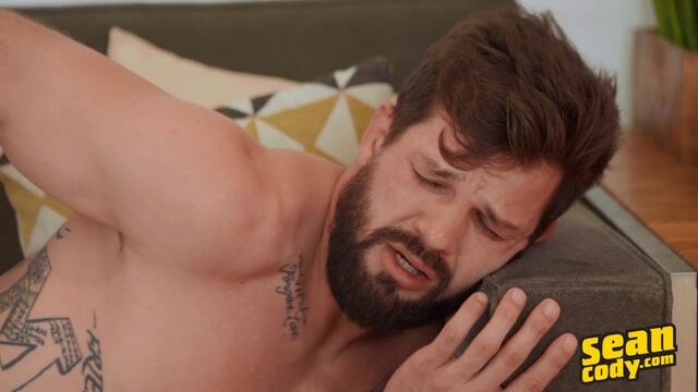 Brysen's already so hard, his boner is tenting his shorts as he starts kissing and undressing Devy, getting to his knees to eagerly swallow the top's cock all the way to the base. Devy pushes Brysen to the couch and rims his hole, then fucks him doggystyle. Brysen rides Devy, and the guys work up a sweat as the top fucks the cum out of Brysen with a deep pounding from the back. Devy's not done yet, and the hunks share intense eye contact as he penetrates the bottom in missionary before cumming all over his face!