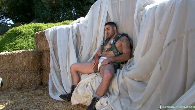 Pretty paratrooper Samuel O'Toole jacking off on his landing spot - On The Set