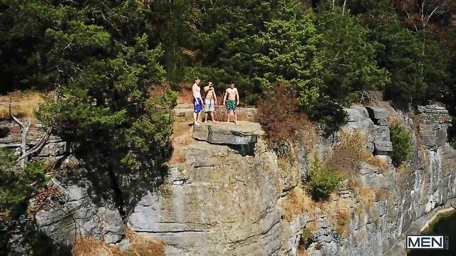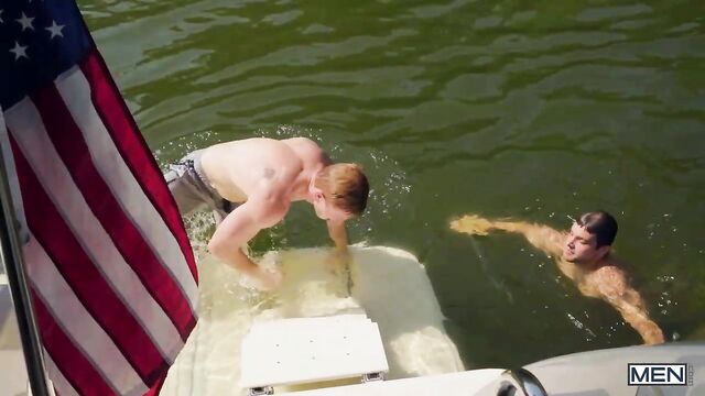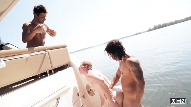 When Johnny Rapid spots two hot guys sitting on the cliffs overlooking where his boat is anchored, he swims over and convinces them to come aboard. But before Johnny can let ginger Kyle Conners and bohemian Xavier Cox into the cabin, they have to obey the maritime law and fuck! Xavier sucks Kyle's cock and Johnny peeks from abovedecks as Kyle sucks Xavier's dick and Xavier fucks him doggystyle. Seeing just how horny these guys are, Johnny lets them use his berth to keep banging, and Kyle wants to take a turn sliding his dick into Xavier's ass. Xavier rides the horny ginger and then the guys each jack off till they cum before going up on deck for a scenic cruise.