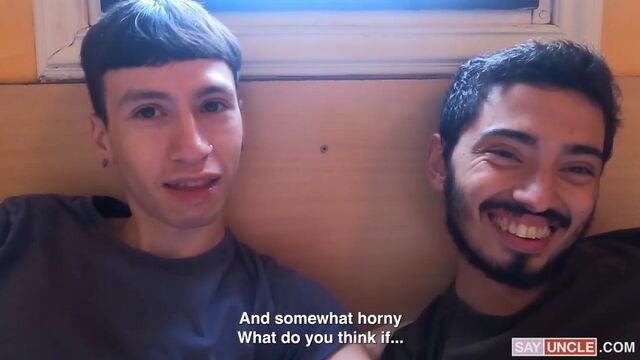 Cesar and Franco are traveling buddies secretly horny for each other. While working out in the hotel’s gym, the cameraman notices Cesar’s bulge and invites them to his room for a private chat. Feeling comfortable together, they start playing with each other’s dick until Franco can’t resist the chance of breeding his mate.