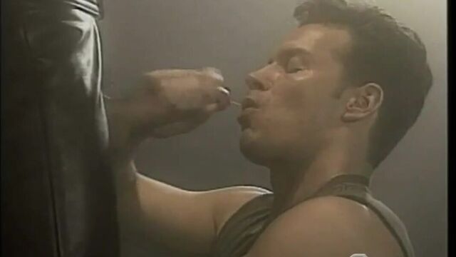 In a fantasy sequence, Ray Butler (in a non-sexual role) imagines shop-keeper Bill Marlowe servicing leather god Kris Lord...sucking the leather-bound stud's mammoth cock until Lord shoots over Bill's face.
