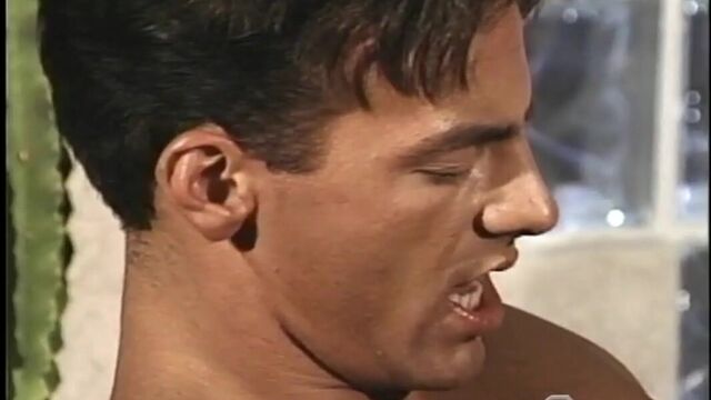 Jeff Hammond and Sean Dickson are stroking themselves by the pool...who'll make the first move? Thick hung Jeff Hammond walks over to hungry brunette Sean Dickson and feeds inch after rock-hard inch down Sean's throat. Stretched out on the deckchairs poolside, Sean takes Jeff's huge pole right down to the balls, feeling the thick cockmeat swell inside him as his own cock slides between the vinyl slats of the deckchair. Jeff places himself on Sean's face, wriggling his meaty asscheeks around Sean's eager wet tongue. Sean swirls his talented tongue aroound and around the puckered asslips, finally spearing Jeff's hole with his probing tongue. Jeff and sean stroke their cocks in tandem as Jeff rides Sean's face. On his back later, Sean grabs his feet and pulls his legs apart, allowing Jeff to slide easily and completely into Sean's hole. Jeff pounds Sean over and over again until he blows his load onto Sean's face, rubbing the sticky cum all over the young stud's sex-flushed face. As he feels Jeff's load run down his cheeks, Sean strokes himself to an amazing climax, his cum splattering everywhere.