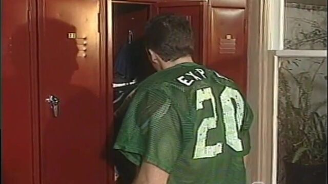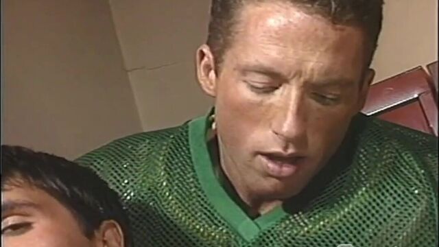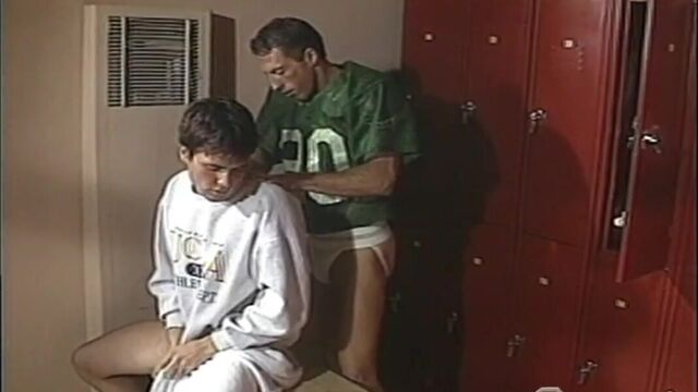 Dean Johnson doesn't even bother to take his shoulder pads off. He drops to his knees in the guy's locker room and swallows Scott Ryder's long hard cock. He can't get enough. He feels that cock slide down his throat, his tongue glides over the satiny surface. Before long Scott is sliding his huge cock up Dean's ass...pumping him hard and fast in the locker room. Simmering in their erotic teamwork, the two studs pump until each boils over in spasm after spasm of thick unleashed cum.