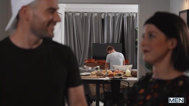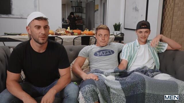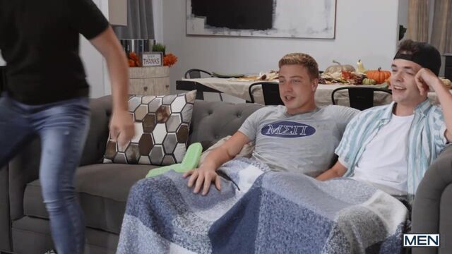 When the TV signal goes out during the big game, Troye tries to fix the TV, and since his ass is already nearly out, what's Logan Aarons to do but fuck it? Logan jizzes in a foam finger just as Troye fixes the TV and their buddy comes back from the kitchen, so they hide under a blanket for some sneaky cock-stroking. When the hostess carries the beautiful golden turkey out and calls them to the table, Logan can't help himself: he jizzes all over Troye's face... and their dinner! At least now the horny guys are free to devour each other's dicks and fuck on the couch before Troye rides the top till he cums, and takes a facial.