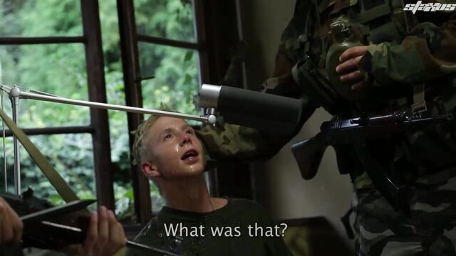 Life in the army can sure be exciting – as Rudy Valentino and Marty Love discover when they’re out on patrol in the Czech countryside. Content to take it easy with a cigarette, they suddenly become aware of the unwelcome antics of young Justin Conway, donning a balaclava and clearly up to no good. After a brief but dramatic chase, they then bundle the blond newcomer into a nearby office, where (you’ve guessed it) the two tops proceed with a very thorough and exacting investigation.It’s the kind of investigation that horny bottoms around the world have wet dreams about, as Conway is pushed and pulled in every direction whilst Love and Valentino take turns to push their hard, uncut cocks down his throat. It’s pretty obvious, however, given the reputation of the two studs, that a good old-fashioned spit-roasting is on the cards for the kid, who’s laid down on his back over a table whilst the two army guys take turns to fuck him raw.But the highlight of proceedings comes when Conway sits himself down on Love’s hard chopper cowboy-style. Little wonder that Valentino spurts like a whale in appreciation; before Love dumps his load all over Conway’s face!