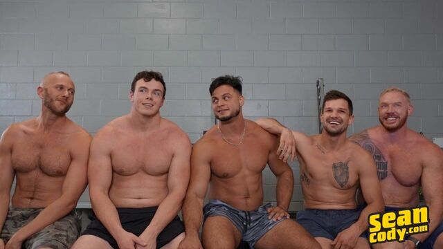 What could be better than some of the hottest Sean Cody newbies paired with a few of our hottest veterans for a five-man orgy? Brysen, Blake, Clark, Axel, and Eddie chill by the pool in their matching Sean Cody swimsuits, horsing around in the water and flashing glimpses of their cocks for the camera. But the orgy action really begins in the gym, with Clark and Blake getting their pump on together until Blake fucks the curly-haired hunk. They're joined by Axel, who helps Blake spit-roast the bottom, and then Brysen joins the party. Once Eddie arrives, he gets Clark to himself as Axel, Brysen and Blake form a train, and these guys' powerful thrusts give the gym equipment a major workout! Clark bends over on a block and takes four big loads on his muscle ass, then lies back and jacks it till he cums.