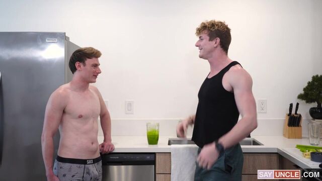 It is hard to sleep when your hunky stepbro Max is making noise in the kitchen. Eric gets off the bed in his tight undies to find Max preparing himself a protein shake. The stud tells his little stepbro that the drink helps him train better, fuck better, and his cum becomes tastier as well. Seeing his stepbro’s disbelief, Max challenges him to try it. Their parents may come back any second, yet the two boys are horny for each other. As Eric kneels to savor Max’s huge cock, he gets horny for more, letting his stepbrother rim him on the kitchen counter. The stepsiblings then decide to move things to the bedroom, where Max fucks Eric till he cums on his bubble butt. Let’s hope they save some so Eric can taste it!