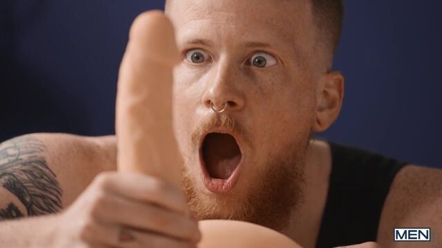Redhead Stevie Trixx can't find his headset and goes to check in his roommate Johnny Donovan's room. The tguy finds something unexpected under the bed: a toy torso and cock that he just has to try out! He strips down and starts riding the toy's dick... which is when Johnny comes home and sees him. The horny top strokes himself and watches as his trans roomie gets off on his toy, then comes up behind him to fuck him doggystyle! Johnny goes down on the redhead, then fucks him missionary. The guys share the toy, then Johnny fucks the bottom spoon, and Stevie shows why his hole is so much better than the plastic one as he rides the top till Johnny cums!