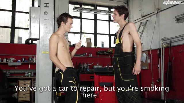 Young Jacob Fluke is a multi-talented twink it must be said – a fact that’s not lost on his horny boss, Timmy Taylor. After all, not only can the boy blow somewhat impressive smoke-rings whilst drawing on a cigarette, he can also blow cock like you wouldn’t believe – and let’s face it, it’s this second skill that attracts Taylor’s attention more than the other when the two fellows encounter each other on the factory floor.Before you know it, Taylor has sidled up to the bright-eyed boy, asked the lad down to his knees and is thrusting his meaty uncut cock out of his overalls and down the boy’s throat. It’s a favour that the boss is subsequently only too willing to replicate in return; but it’s pretty fucking obvious that ultimately it’s gonna be Fluke’s tight little pucker that’s set to be the chief attraction in this garage. So it proves, with Taylor first rimming the hungry hole, then slipping his shaft deep inside.The ensuing rough fuck, with Fluke bundled over machinery, taking every inch of dick like a pro in the process, is hot enough; but it’s Fluke’s tongue-tastic reception of his boss’ creamy eruption that’ll have you jerking off with sweaty, knuckle-tight rigour!