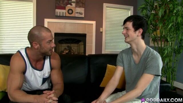 Rod Daily was apprehensive at first to agreeing to a fan contest. Considering all the things that could have gone wrong, the fact that Jasper Robinson won is just great with Rod. Jasper is giggly and nervous, but he's got a great look and is eager to shoot with Rod, and his reverence of Rod's body is apparent. Even though he's the contest winner, Rod takes control of the awe-struck Jasper, stripping down and flexing as Jasper caresses Rod's body up close and personal. Much better than fantasizing from afar, Jasper takes Rod's cock in his mouth and tongues his balls. Rod pushes him back against the sofa and returns the favor, and Jasper almost explodes from the thrill of it. With cocks fully erect, Rod penetrates Jasper as Jasper emits a moan of pleasure. It's not every day a fan has his fantasy fulfilled, and Jasper is soaking up every second of it, leaking pre-cum as Rod pumps him from behind, before finally exploding all over himself as Rod fucks him missionary. Rod then pulls out and leaves Jasper one final parting gift- a blast of cum that Jasper won't soon forget. Enjoy!