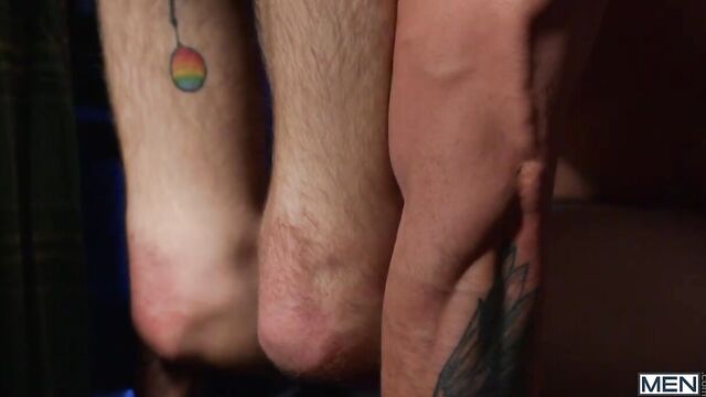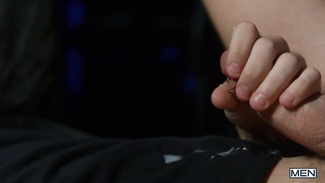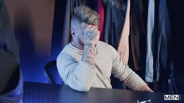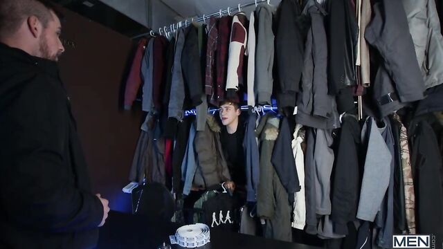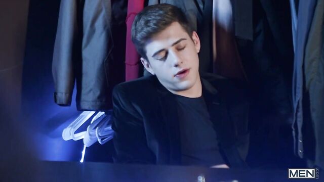 Coat check guy Joey Mills is bored and the coast is clear, so he gets out his cock and starts stroking it. Joey gets so into his self-pleasure that he doesn't even notice as William Seed approaches, and William quietly enjoys the show! When Joey finally looks up and sees the muscular French stud taking him in, William gets out his own dick and hops over the counter to feed it to the pretty twink. While Joey has his hands--and mouth--full, William helps out a customer before taking Joey in the back to bend him over and fuck that ass. Joey cums hard and William gives the twink a facial.