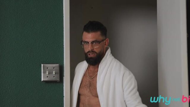 When Dante Colle goes back to his college girlfriend's house for the weekend, he sees her dad, Alpha Wolfe, fucking her stepmom, McKenzie Lee, in the kitchen and eagerly spies on them! Dante gets caught watching, but he's so horny he sneaks up and cuts his own glory hole in Alpha's newspaper, then sucks the DILF's dick. McKenzie drags Dante to the bedroom by the hair, but it's only fair that she gets her pussy eaten. Alpha walks in and catches Dante fucking his wife, and he's gonna show the college guy how's it's done! After pounding McKenzie doggystyle, Alpha rides Dante's dick and McKenzie rides her husband, keeping up the train till both guys cum on McKenzie's big tits.