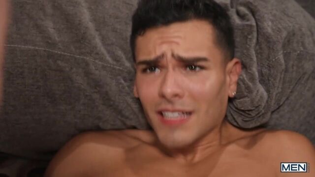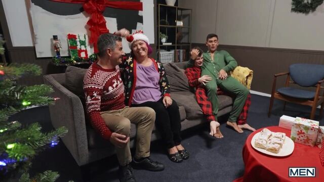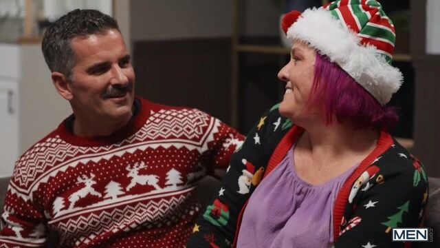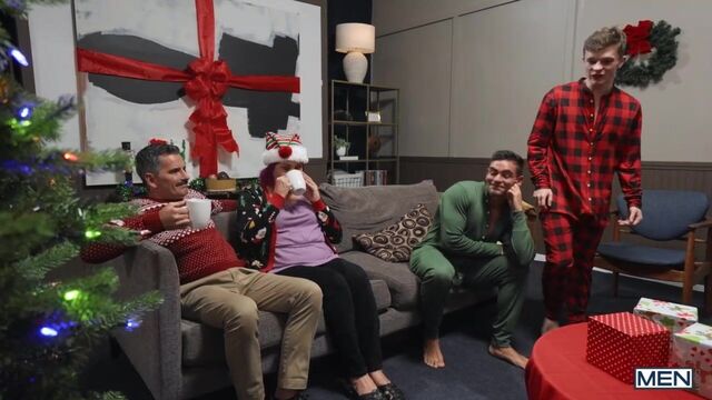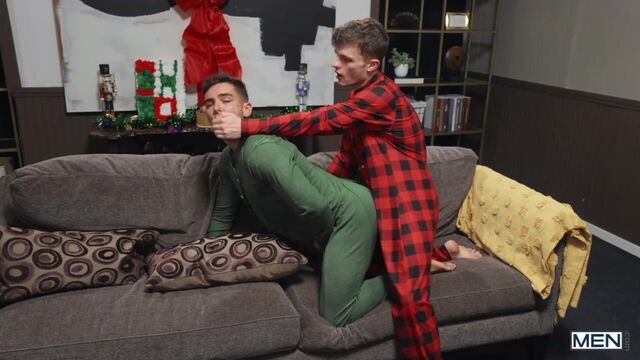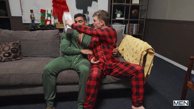 When Jake Preston wakes up with a boner in his holiday PJs, he asks his boyfriend Damian for attention, but Damian doesn't want to fool around at his parents' house. The unconcerned Jake goes downstairs with an obvious tent in his onesie, so Damian runs after him to try to hide it from the folks! Jake pulls his hard dick out and convinces Damian to spread his butt flap for some sneaky doggystyle, then Damian rides his man on the couch. Once the coast is clear, the twinks strip off to suck each other, and Jake pounds Damian in spoon and missionary till they cum for a jolly holiday present!