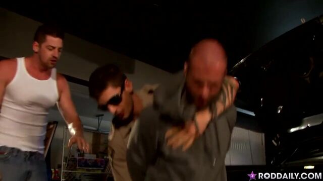 Rod Daily thought he had committed the perfect crime. Absconding with Andrew Stark's bag, Rod suspects that he's made a clean getaway until Andrew and cop friend Officer Tyler Torro roll up and discover him walking the side of the road. Caught red-handed, Rod is at the mercy of Officer Torro, who is clearly prepared to handle things in a somewhat unorthodox manner. Rather than taking him downtown, Tyler has decided on a little bit of payback- so he shoves Rod into his trunk and transports him back to his private garage. Once there, Tyler lays out the rundown for a confused Rod and Andrew. Rod can either take his punishment here in the garage or he can take his chances downtown. Rod chooses the former, and so Andrew shoves his dick down Rod's throat as Tyler undresses and strokes his cock. Bending Rod over, Andrew first wets his hole with a little ass eating, then plunges his cock deep into Rod's waiting ass as Tyler chokes Rod with his dick. Sucking Tyler off as Andrew pounds him from behind, Rod's own dick is growing rock hard. Moving down to the floor, Rod rides Tyler's night stick as he sucks on Andrew, jacking his dick and spraying a load in the process. The whole sight is too much for Tyler to take, and almost immediately he rips off his condom and explodes as well, which is shortly followed by Andrew showering Rod with his own load. Guess it's just like they say: A couple loads to the face beats some jail time any day. Enjoy!