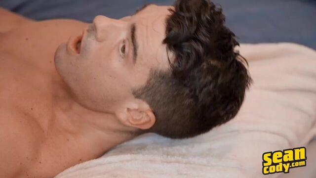 Blond, bearded Brogan meets dark-haired, handsome Presley, and the chemistry is flowing right away. The guys undress each other and Presley worships Brogan's cock in a slow, sensual blowjob before sitting on the top's face until he needs to get that cock inside him! The bottom slowly eases down on to Brogan's hard dick, then gets pounded in bareback doggystyle. "Oh, fuck my hole!" Presley moans as he shoots all over Brogan's broad chest, begging for more until the top pulls out and cums on his ass.