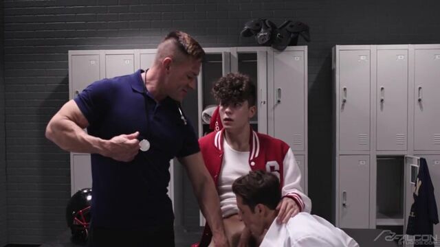 Football twunk Drake Von is embarrassed when he pops a boner in front of muscular doctors Bruce Beckham and Taylor Reign, but both docs assure the hung athlete that he has nothing to be ashamed of and in fact, they actually want to further examine his bushy hard-on. With Drake's girthy dick being so fat that it requires both of the medical men's oral attention, they begin sucking him off before working their way to his fur-lined hole. Drake then gets a chance to show off his own tongue's talents as he rims both of the bent-over physicians. Still in the team's locker room, Drake and Bruce start stuffing Taylor at both ends with each of them taking turns barebacking the doctor's ass. Getting double-teamed by the young jock and the daddy doctor has Dr. Reign cumming all over his stomach with Drake and Dr. Beckham then unloading themselves on bottom's face and still-stiff dick.