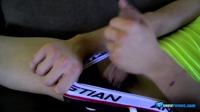 Hot uncut jock Jimmy Roman shoots a huge load in his tight Andrew Christians!