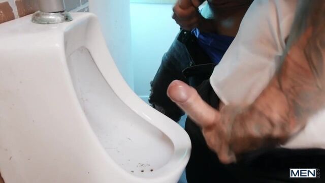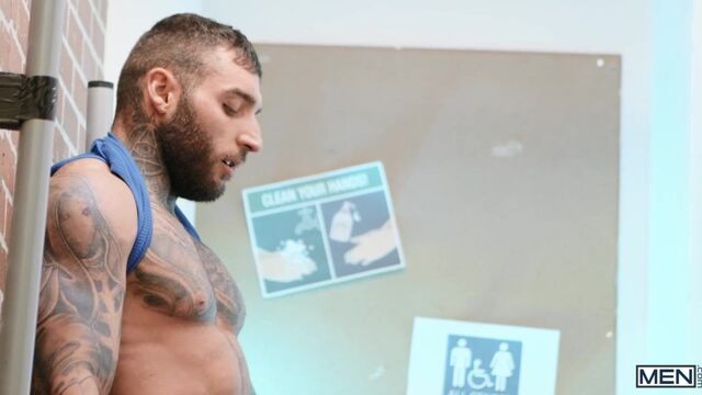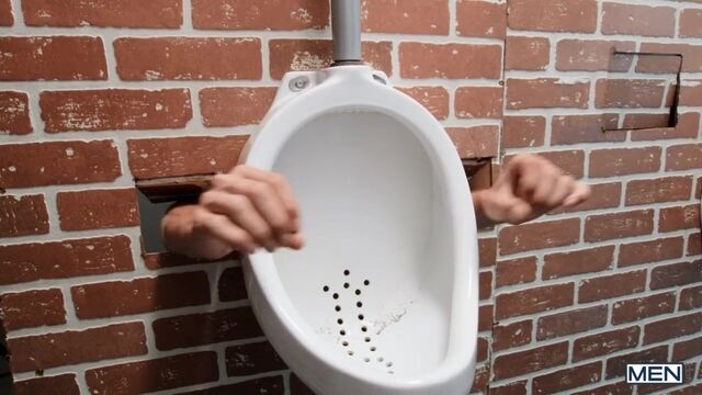 Tony D'Angelo goes into the bathroom looking for a hookup. The guy next to him at the urinal isn't interested... but the urinal is! A pair of hands appear from either side of the appliance and stroke him off, then point the way to a hole where an ass appears for him to fuck. Security guard Johnny Donovan catches the top and decides to get in on the action, sucking Tony's cock and cumming in the urinal before the tattooed hunk uses his cum as lube to go back to the hole in the wall until he blows his load!