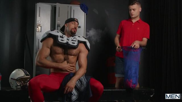 Towel boy Ryan Bailey checks out muscled stud Travis Connor in the locker room after the football game and tells the player he can use Ryan to dry off! Travis is ready to get in the twink's tight end, but first Ryan sucks his cock, and Travis rims the bottom. The horny player pounds the towel boy doggystyle against the lockers, then picks him up for a stand-and-carry. Ryan goes for every inch as he rides the top on the bench, then gets pounded on his back until he shoots his load, and Travis goes deep for a creampie.