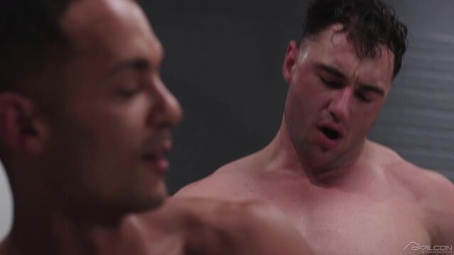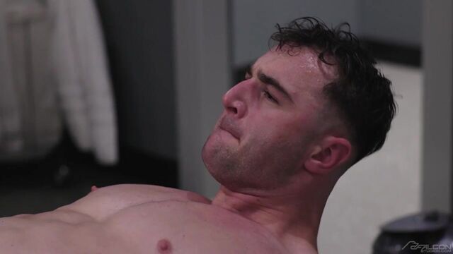 Fresh out of the locker room shower, Michael Boston can feel the curious eyes of AJ Sloan watching his every move as he towels off his naked body. Michael doesn't seem to mind though and is soon presenting AJ with his already-hard cock to suck down. With anyone able to walk in and see them at any given second, AJ blows the jock before getting into position for Michael to finger and rim his sweaty hole on a nearby bench. Michael gets his second workout of the day in as he thrusts himself into AJ's ass and barebacks his hole in the middle of the college locker room. Non-stop fucking his teammate and having AJ ride his cock has Michael pulling out to unload into his bottom's open mouth with AJ then covering himself in nut as Michael's massive cheeks take a seat on his face.