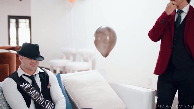 - Description: A straight groom-to-be, Michael Boston, is enjoying his bachelor party when his mischievous groomsmen begin teasing him about a surprise they have planned. He is suspicious, reminding them that his wife-to-be said that there were to be NO STRIPPERS at the party. The groomsmen skirt around this and are sly as they tell Michael to close his eyes, which he does.But when Michael opens his eyes, he finds himself staring at Lucca Mazzi, who is smiling charmingly back at him. The groomsmen have a laugh, saying that Michael's wife-to-be never said anything against having MALE strippers!Michael is embarrassed and rolls his eyes, though decides to let this little joke play out, especially since Lucca doesn't seem to mind. In fact, Lucca confidently puts on a stellar show for Michael and his rowdy groomsmen... and Michael secretly and unexpectedly gets turned on.After the show, Michael's groomsmen move elsewhere in the house to finish with the rest of the party, clearly done with their little joke. Meanwhile, Michael sees Lucca out but sparks fly in the doorway as Michael realizes he still wants a bit more fun...They get hot and heavy, while trying to keep things down so that Michael's groomsmen won't hear. They exchanged heated kisses as they strip each other down, eager to get hold of each other's cocks. But Michael wants the main event and it's not long before he's being pounded against the door by Lucca. As they move from the door, to the stairs, to the floor, it's definitely turning out to be the best surprise Michael's EVER gotten... especially when it ends in a creampie!