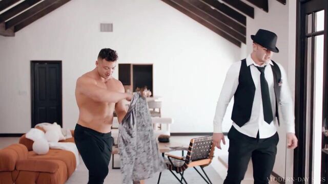 A straight groom-to-be, Michael Boston, is enjoying his bachelor party when his mischievous groomsmen begin teasing him about a surprise they have planned. He is suspicious, reminding them that his wife-to-be said that there were to be NO STRIPPERS at the party. The groomsmen skirt around this and are sly as they tell Michael to close his eyes, which he does.But when Michael opens his eyes, he finds himself staring at Lucca Mazzi, who is smiling charmingly back at him. The groomsmen have a laugh, saying that Michael's wife-to-be never said anything against having MALE strippers!Michael is embarrassed and rolls his eyes, though decides to let this little joke play out, especially since Lucca doesn't seem to mind. In fact, Lucca confidently puts on a stellar show for Michael and his rowdy groomsmen... and Michael secretly and unexpectedly gets turned on.After the show, Michael's groomsmen move elsewhere in the house to finish with the rest of the party, clearly done with their little joke. Meanwhile, Michael sees Lucca out but sparks fly in the doorway as Michael realizes he still wants a bit more fun...They get hot and heavy, while trying to keep things down so that Michael's groomsmen won't hear. They exchanged heated kisses as they strip each other down, eager to get hold of each other's cocks. But Michael wants the main event and it's not long before he's being pounded against the door by Lucca. As they move from the door, to the stairs, to the floor, it's definitely turning out to be the best surprise Michael's EVER gotten... especially when it ends in a creampie!