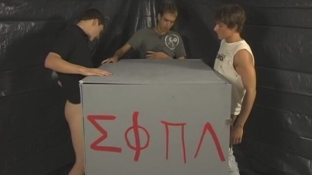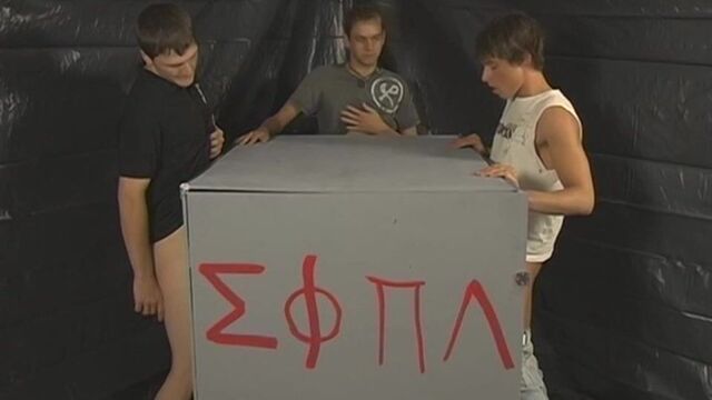 Don't act surprised that these frat boys built their own gloryhole box--what else are they going to do, study' Alex, Blair and Kameron stuff superstar twink Dillon Samuels into their homemade gloryhole box and give him only one way out... sucking them all off! Dillon, like a champ, sucks those cocks until all three boys cum in his mouth.
