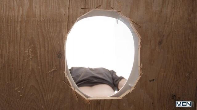 Theo Brady and his buddies have built the ultimate prank: a fake porta potty. Now all they have to do is wait with their cameras out for an unsuspecting mark to step inside. Once twink Jordan Lake sits on the seat, he's shocked by dicks coming at him from either side while Theo fingers his hole. The guys tear down the walls, leaving Jordan with his pants down, but Theo walks him home to give him a prize for being such a good sport. Jordan sucks the top's cock, then Theo drills him in doggystyle. The bottom rides the tattooed hunk, and Theo pounds the cum out of him in missionary, then finishes on his face.