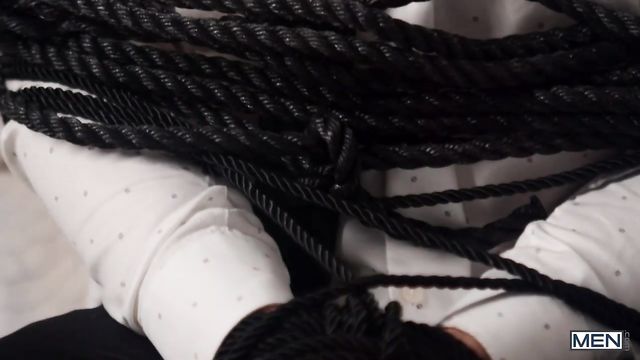 Sexy Michael Boston is feeling a little frisky in his leather jockstrap with matching whip when he’s interrupted by the gorgeous William Seed, asking to use his phone. After a very suspicious phone call, William’s attention is turned to the sounds coming from Michael’s room, only to discover that Michael has the handsome Thyle Knoxx tied up with his mouth tapped in his bed! William tries to sneak out, but Michael catches him and invites him to stay and play, an offer he can’t refuse. Michael sits William on the bed and proceeds to go down on his thick and meaty, uncut cock as a wide-eyed Thyle looks on. His deep-throating skills are so amazing that neither hunk notice Thyle trying to leave the room and stumbling on William’s duffle bag full of cash. Michael then starts riding William’s huge cock every-which-way possible until Michael gets so deep inside him that he cums all over himself, and William blows his load all over Michael’s face and pretty mouth.