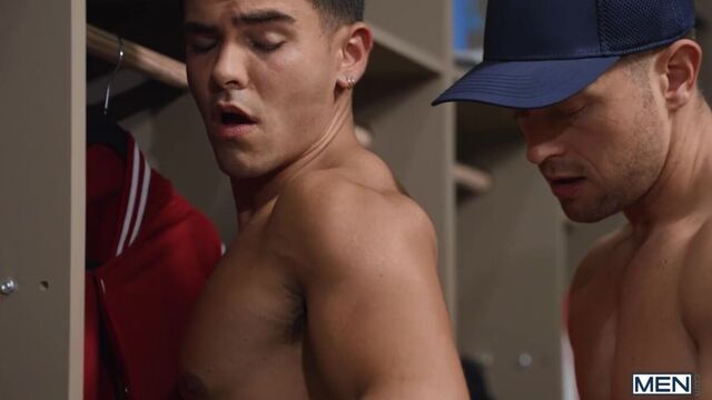 Coach Johnny Donovan gives hungry up-and-cummer Damian Night a little extra hands-on instruction in the locker room. Damian needs some pointers on his swing, and Johnny takes his shirt off so he can really show Damian how to get his core and hips working. The coach gets hard checking out his best player's ass, and Damian eagerly sucks the top, then shakes his booty before Johnny pounds him doggystyle against the lockers. Riding the bench has never been so much fun as the bottom rides his coach's bat till Johnny cums on his hole.