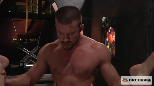 Kyle King returns to find Kennedy Carter bound, gagged and covered in cum. Pissed that Carter has fallen prey to other men in the Sanctuary, King roughs him up a bit before he straddles the young stud. King pushes his round, muscular ass onto Carter's face while he concentrates on sucking Carter's huge uncut cock and balls. King continues his aggressive fucking of Carter's ass, first licking and eating the hole then fucking him hard. They both work their fat cocks until they explode covering Carter in even more thick white goo.
