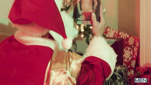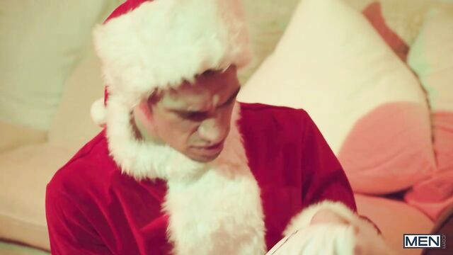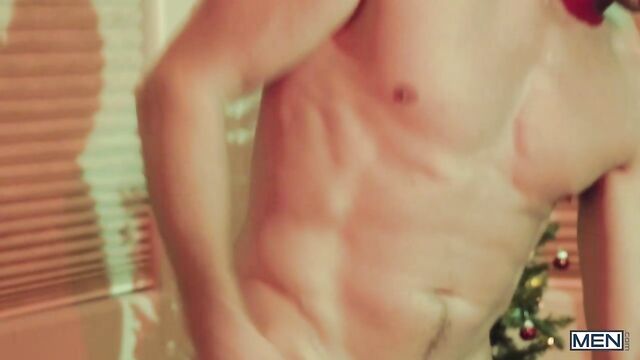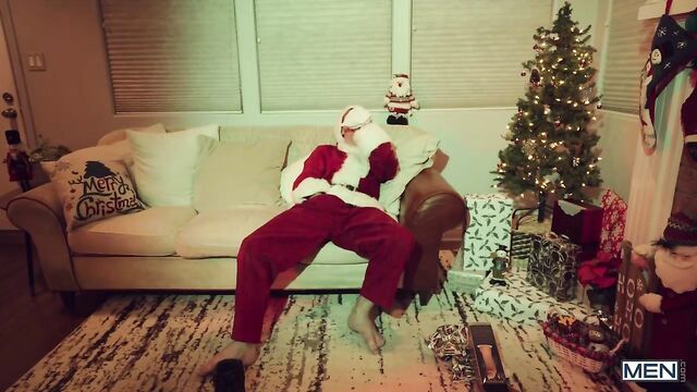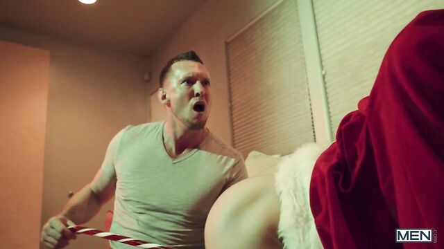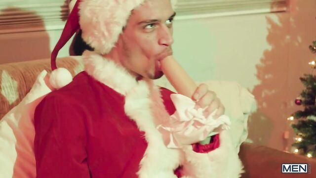 Pierce Paris and JJ Knight have hung up the stockings, trimmed the tree, and left out the milk and cookies for Santa, and they're all ready for their first Christmas together, but the red-suited man who creeps into the house that night isn't Saint Nick, but sinner Michael Del Ray! Michael helps himself to some treats and opens a present, soon fucking his ass with the dildo JJ intended for Pierce. Pierce comes downstairs and catches the burglar red-handed, so he sticks his candy cane up Michael's ass...and Michael loves it! Soon it's JJ who hears a noise as Pierce pounds the intruder's hole, and the couple make their holiday merry by fucking Michael's mouth and ass till he cums, then leaving huge snow-white loads all over his face.